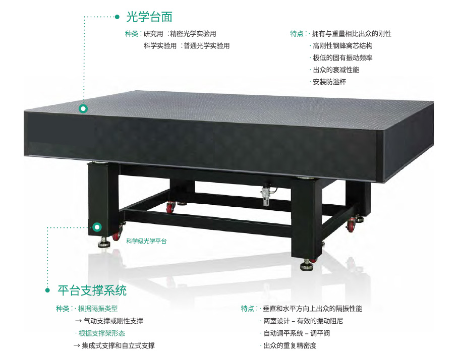 另外,使用由高性能空氣彈簧減振系統(tǒng)組成的支撐架,在各個(gè)方向上發(fā)揮著出色的減振性能。因此,能夠不受周邊環(huán)境影響,進(jìn)行有效的精密光學(xué)實(shí)驗(yàn)。