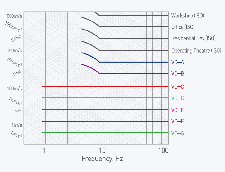 為了作出區(qū)分,人們進行了很多的研究,并且發(fā)現(xiàn),根據(jù)頻率的不同,設備所做出的位移響應雖然不同,然而速度響應幾乎是相同的。因此為了規(guī)定各種活動以及對于設備所允許的振動級標準,我們使用1/3倍頻帶(1/3 Octave Band)速度譜(Velocity Spectrum)。這一標準曲線的有點是能夠表示出速度的有效值來表達出振動,而非用位移或者加速度來表達,以及如果設備種類相同,性能開始受影響的速度值也基本相似。(三思減振器)