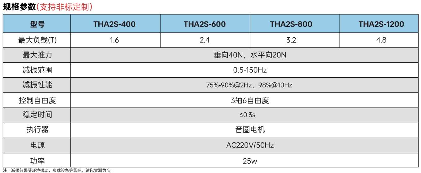 · THA2S系列主動(dòng)減振器采用金屬?gòu)椈勺鳛楸粍?dòng)隔振單元,具有優(yōu)異的穩(wěn)定性及全頻段振動(dòng)衰減性能。無需氣源即可使用,使用手動(dòng)調(diào)節(jié)方式進(jìn)行水平調(diào)節(jié)。